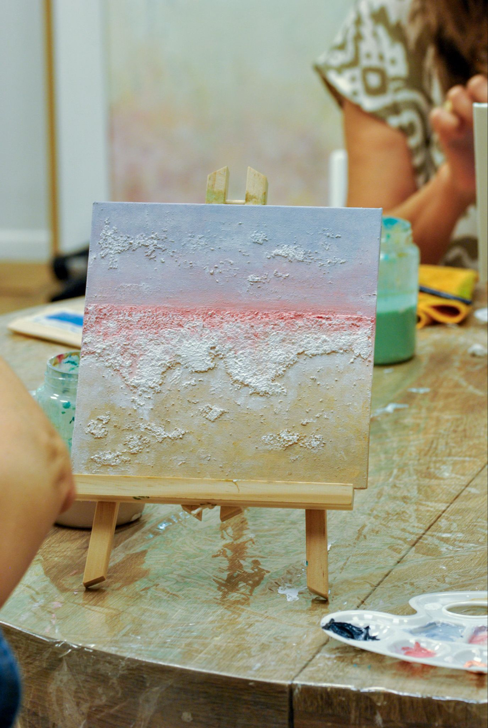 En el mismo espacio, nos esperaba una mesa preparada con todo lo necesario para crear nuestro propio cuadro. Cristina nos enseñó paso a paso la técnica del acrílico y las texturas. El resultado fueron obras únicas y personalizadas que cada participante pudo llevarse a casa junto a un posavasos pintado a mano por Cristina, un detalle lleno de cariño que convirtió la experiencia en aún más especial.